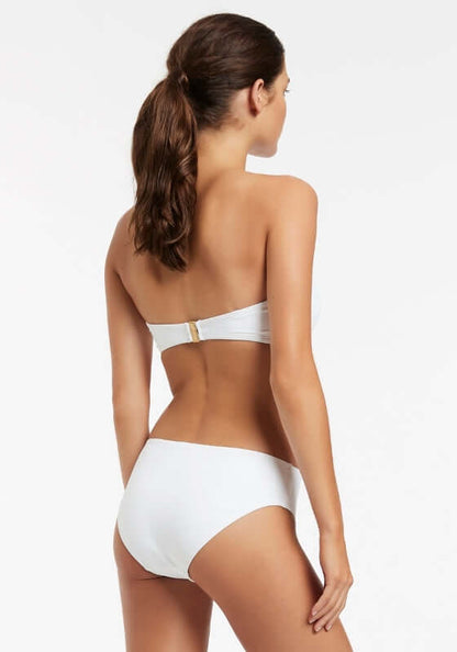 Turn heads in the Jetset Bandeau bikini in white by swimwear designer Jets Australia. The timeless bandeau white bikini top features a U bar detail along with removable cups and optional halter ties for support. Pair with U trim pant with matching gold trim details for a stylish poolside look.