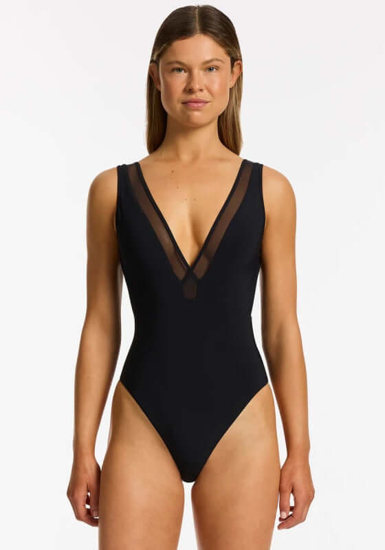The Jetset Lure Plunge Swimsuit Black is made from a recycled matte fabric for a sustainable choice. With a deep plunge neckline and regular coverage mesh details, this swimsuit is perfect for A-C cups. Removable cups provide shape and support for all-day comfort.