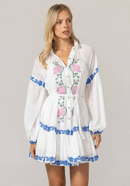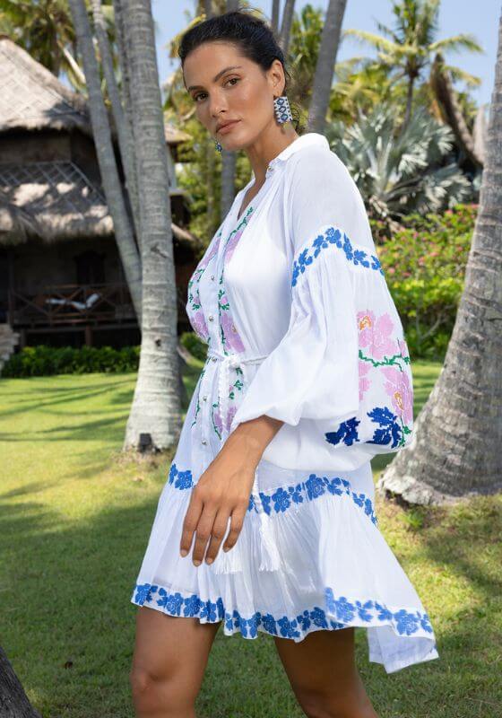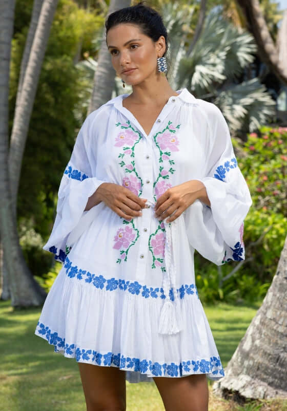 Look chic in the Jodie Dress by resortwear designer Miss June.   This pretty mini dress features a button down front with contrast panels, floral embroidery, short sleeves and a self tie belt.   Available in one size fits UK 8-14.  100% Viscose