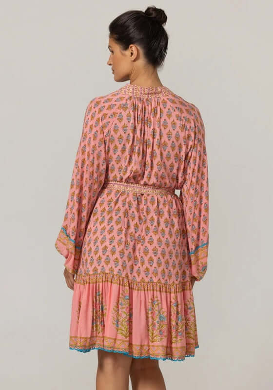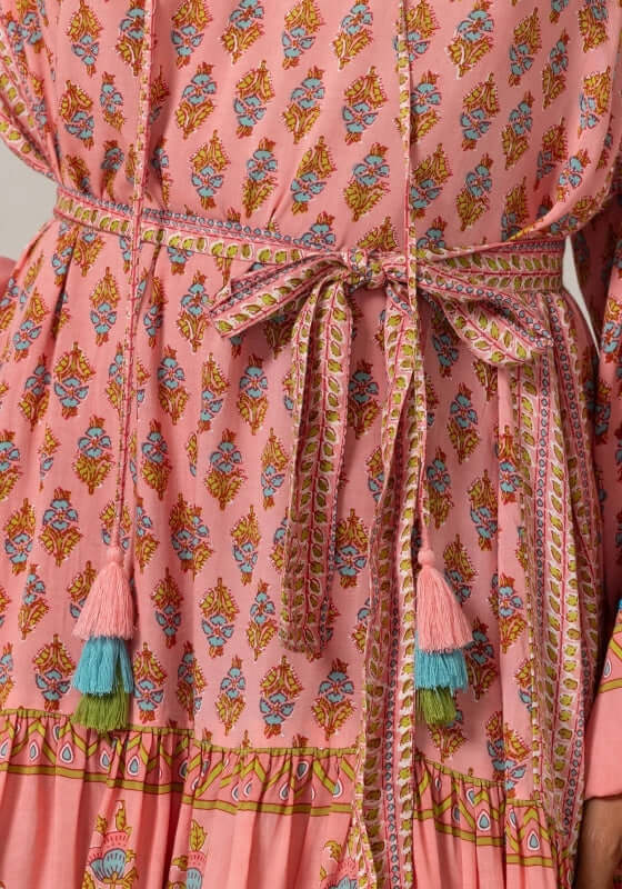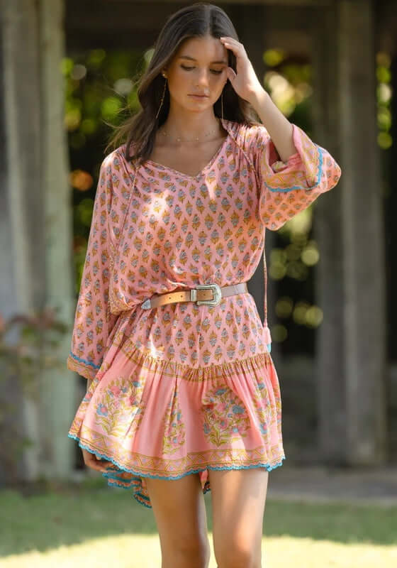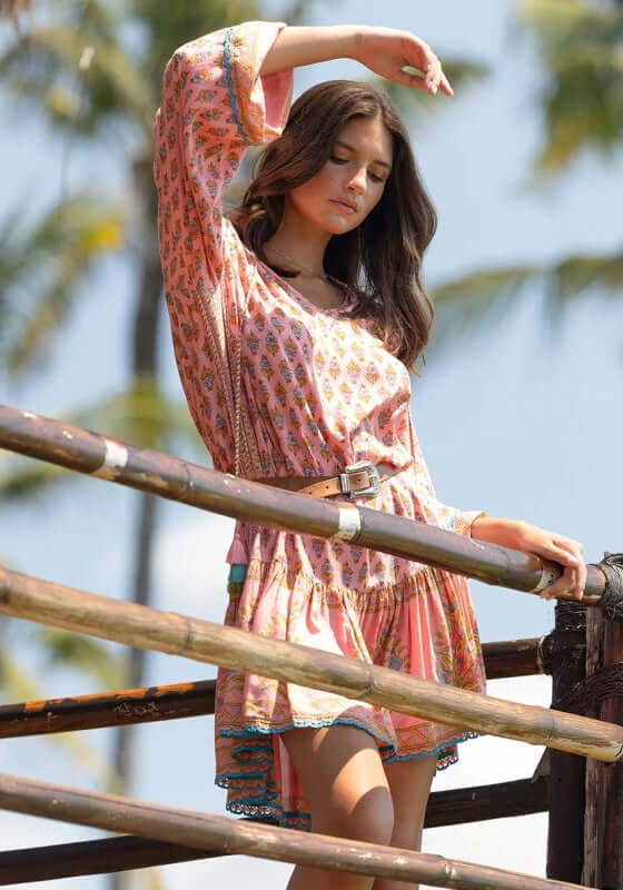 Introducing the Kaida Dress, a romantic and feminine piece by Miss June Paris. Embrace the boho chic style with delicate floral patterns, puffed sleeves, and a ruffled hem that moves gracefully. Perfect for adding a touch of sophistication to your wardrobe.