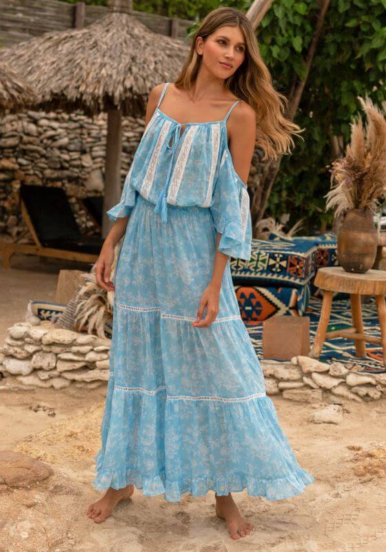 Look effortlessly chic in the Karena Kaftan Dress in Blue by resortwear designer Miss June.   This stylish maxi kaftan in a blue floral print features an off the shoulder neckline with spaghetti straps and tassel ties, finished with lace inserts across the body and skirt.   Available in one size fits UK 8-14.  100% Cotton voile