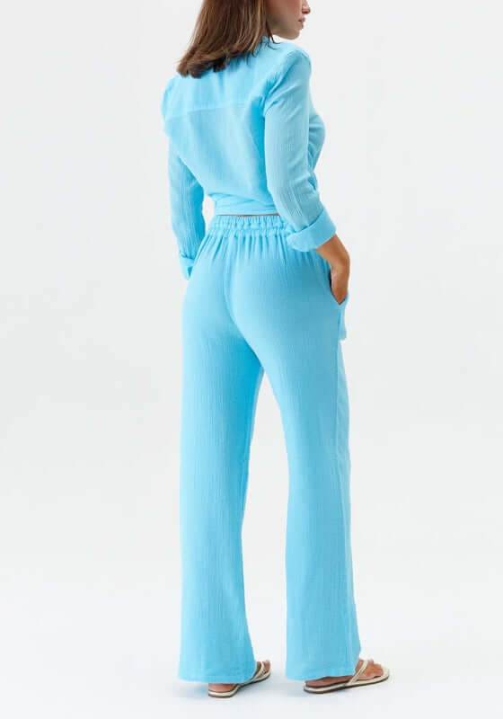 Look chic in the stylish Krissy Trouser Turqupise by resortwear designer Melissa Odabash.   These comfortable wide leg pants are made from soft lightweight cotton in blue stripes and feature an elasticated waist and side pockets. 100% Cotton