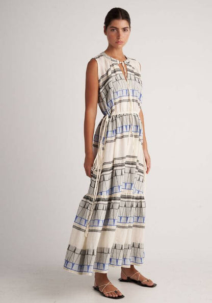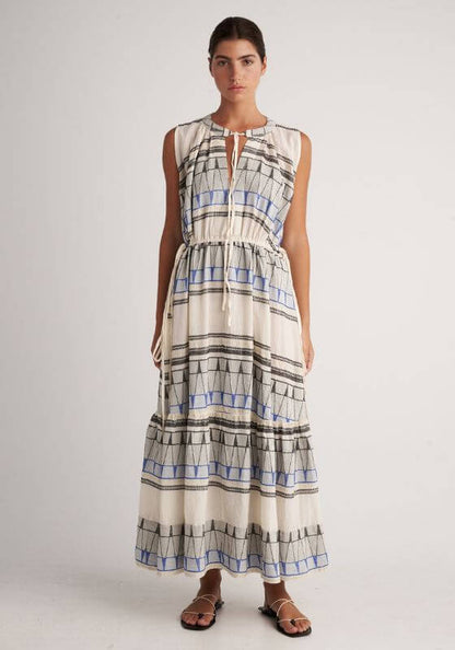 Look chic in the beautiful Kyklades Maxi Dress by resortwear designer Pearl & Caviar. Made from soft cotton with contrasting panels, this sleeveless maxi summer dress features a tie neckline and a loose fitting tiered skirt.