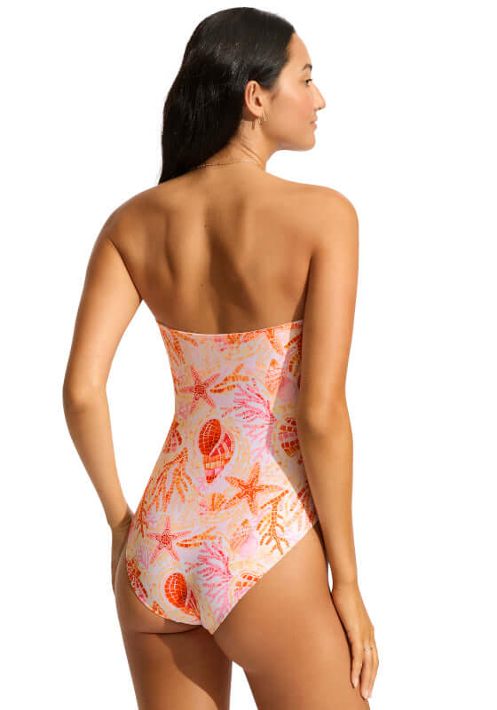 Make a style statement in the La Mer Bandeau Swimsuit in white and pink by swimwear designer Seafolly.   In an aquatic print with coral and starfish motifs, this chic bandeau swimsuit features a flattering twist front with padded cups and optional straps to create a flattering fit.