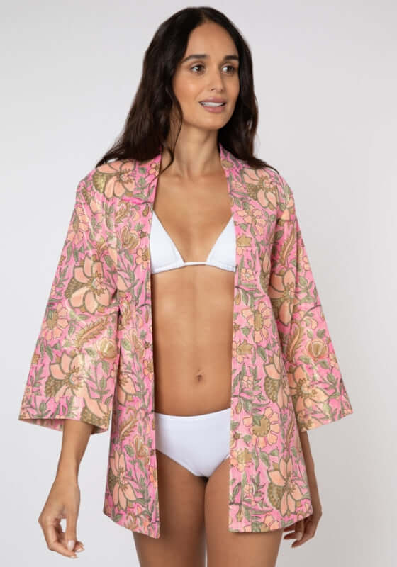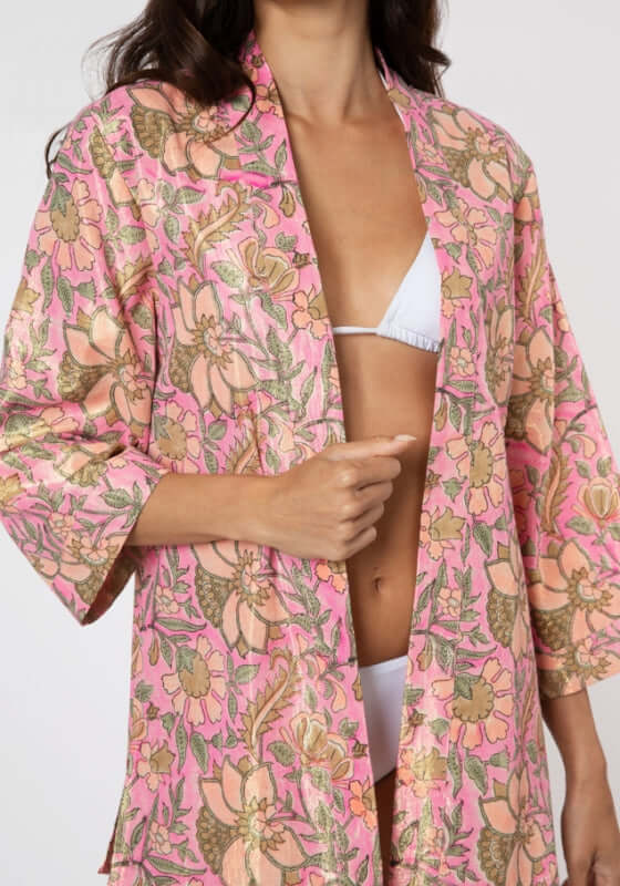 Complete your beach look with the Lame Short Kimono in a floral pink print  by beachwear designer Juliet Dunn. This beach kimono features a shirt like style with a colour and flared sleeves to give a chic finish to a fun design.