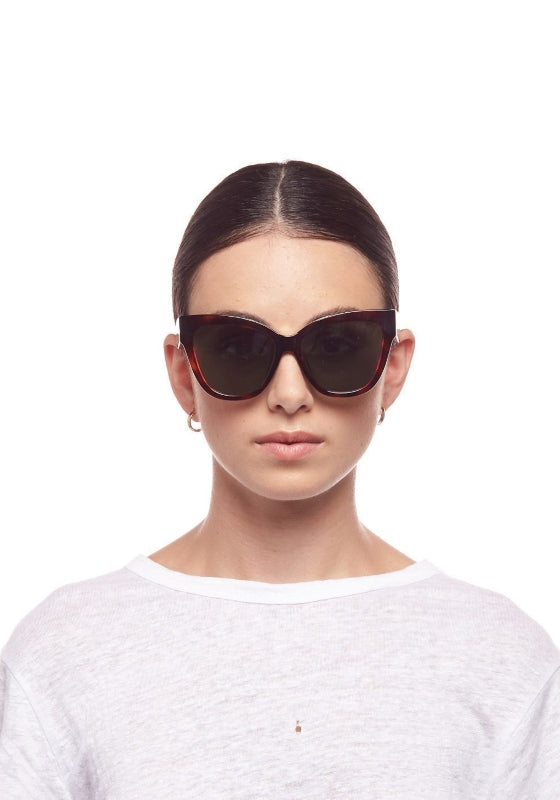 Turn heads in the Le Vacanze sunglasses in Tort by designer Le Specs. The glamorous thick framed glasses with a subtle cat-eye style is finished with Smoke Grad lenses for a chic look.