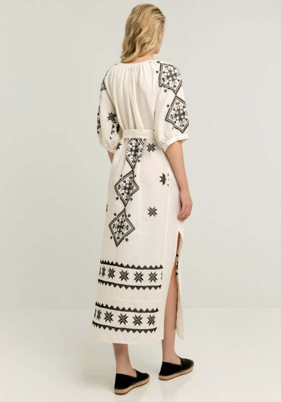 For an effortless summer look choose the Lefkada Belted Midi Dress with Black Embroidery by resortwear designer Greek Archaic Kori. This kaftan like dress features a small v neck line with mid length puff sleeve offering a covered up look but still breathable and perfect for the summer heat. Beautifully decorated with lefkada inspired black embroidery.