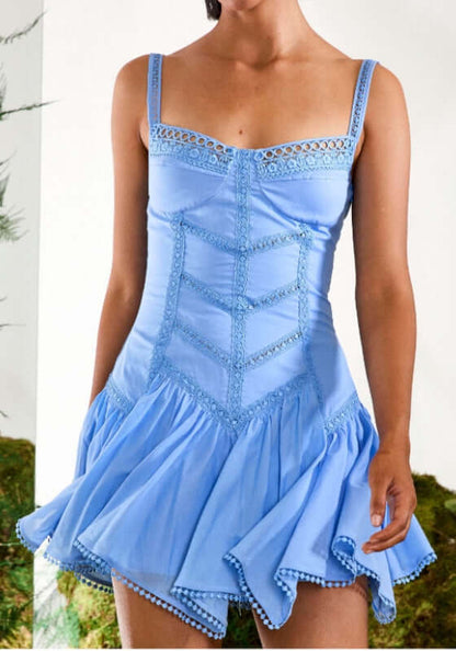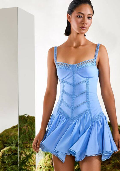 This washed blue Lira short dress by resortwear designer Charo Ruiz offers a feminine and playful look with its skater skirt and sweetheart neckline. The voile and guipur fabrics add delicate details, making it perfect for any occasion.