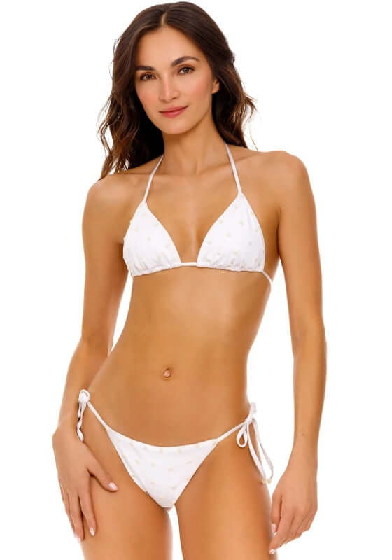 Introducing the bestselling adjustable triangle slider top, the Lolita Tales Bikini in White by beachwear designer Agua Bendita. Handcrafted beading adds a unique touch to the classic white triangle bikini and adjustable strings provide a customizable fit. Shop timeless poolside style with our designer bikinis UK.