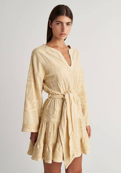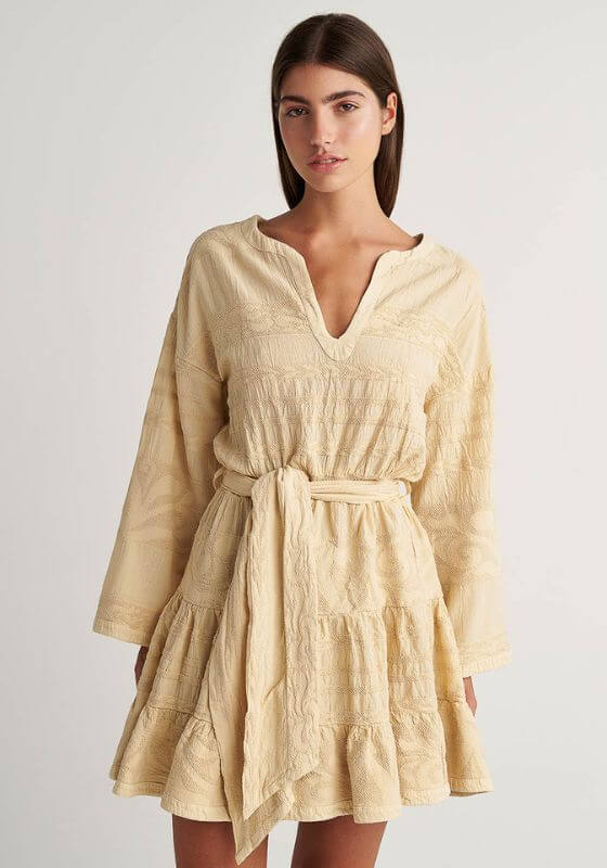 Turn heads in the stunning Mani Belted Dress by resortwear designer Pearl & Caviar. This versatile cotton beach dress can be worn as both a dress or a beach kaftan, features a v neckline, bell sleeves and a tiered skirt finished off with a tie belt.