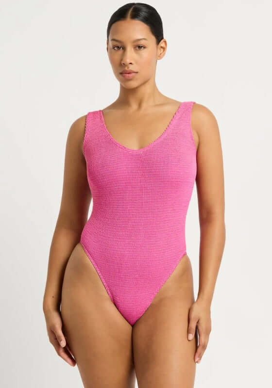 Turn heads in the Mara Swimsuit from swimwear designer Bond Eye. In wildberry, this crinkle one piece has a flattering scoop neckline, wide shoulder straps, a low scoop back and a high cut leg. The Mara is a must have addition to your beach wardrobe, Made from stretchy crinkle fabric, available in one size fits 8-14 UK