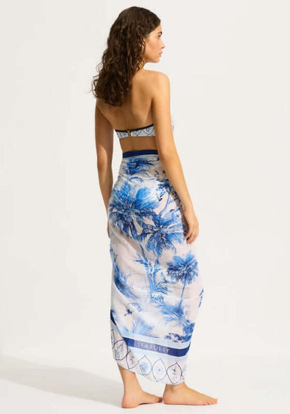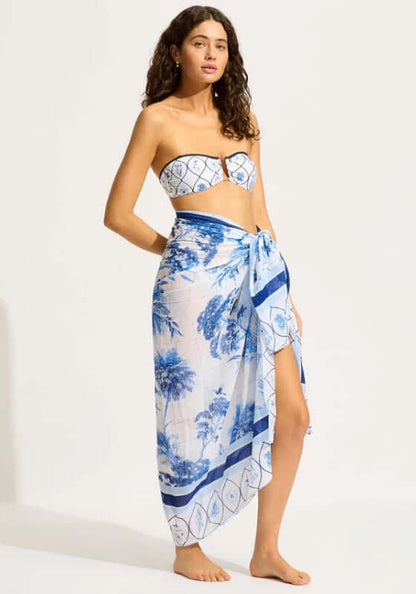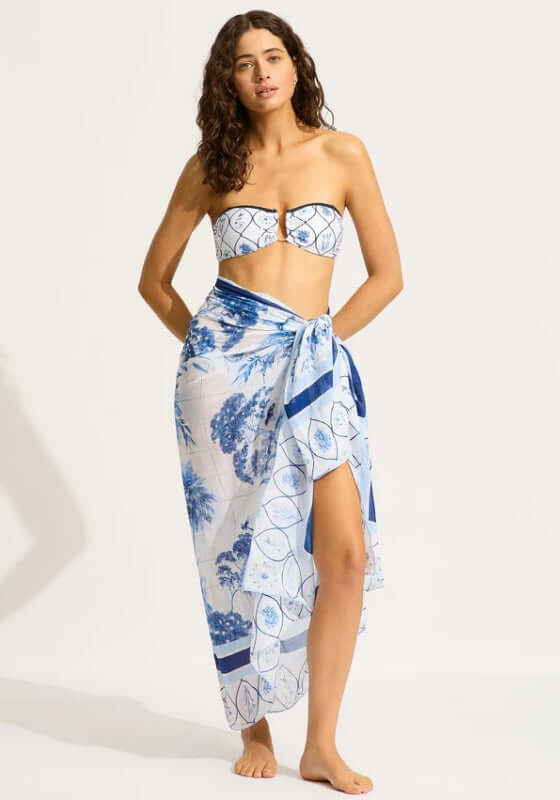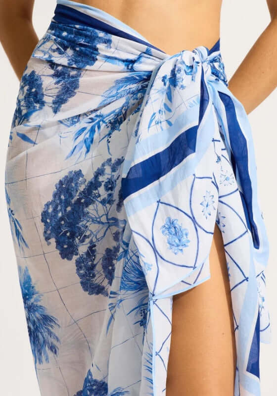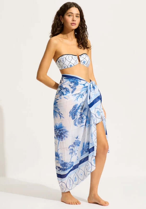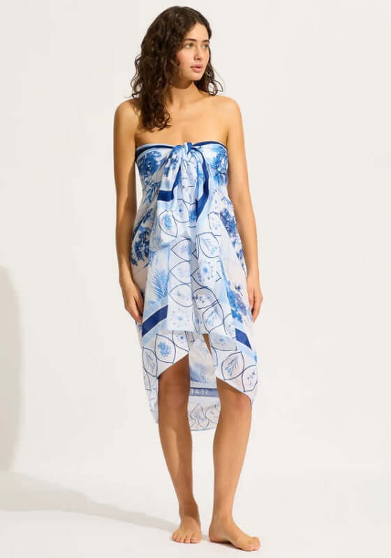 The Marbella printed Sarong by designer Seafolly can be styled in several different ways. This bold blue and white print can brighten up any bikini or be paired with the matching swimsuit or bikini for a chic poolside look.