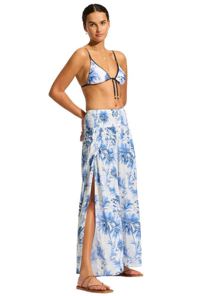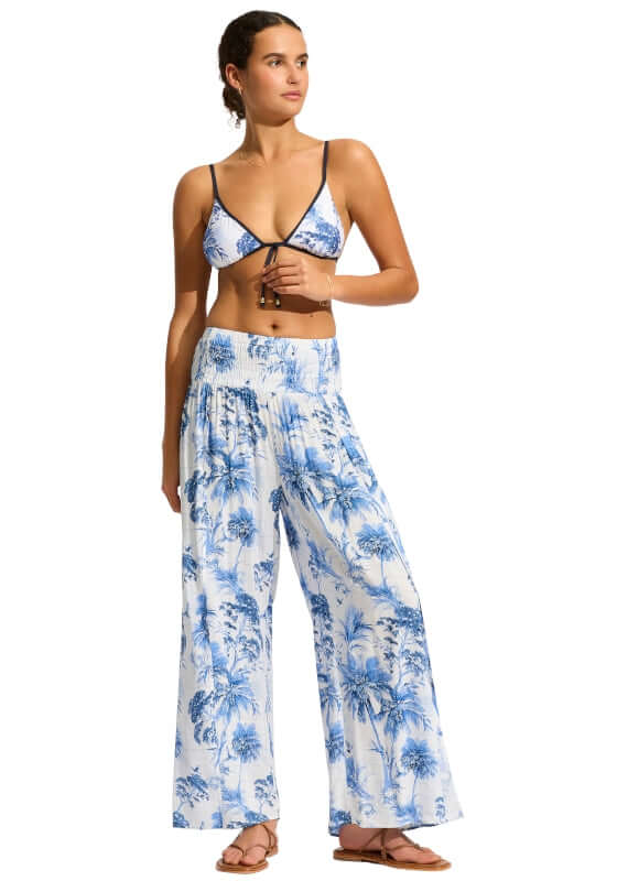 Look effortlessly chic in the stylish Marbella Shirred Waist Wrap Pants by beachwear designer Seafolly.   In a blue and white tropical print, these lightweight, breezy pants feature a ruched elasticated waist, with sexy splits to the thigh.