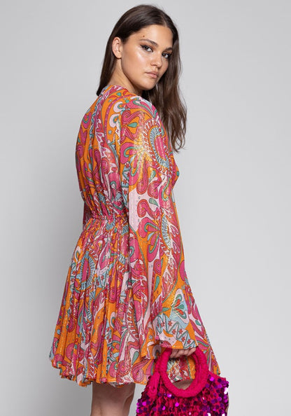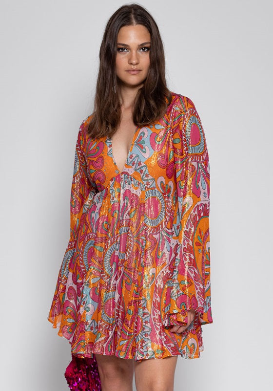 Look effortlessly chic in the Maud Dress in Havana Framboise by Resortwear designer Sundress.  In a psychedelic print with shiny threads this v neck mini dress features flared sleeves and skirt, with a elasticated back for a more tailored look.