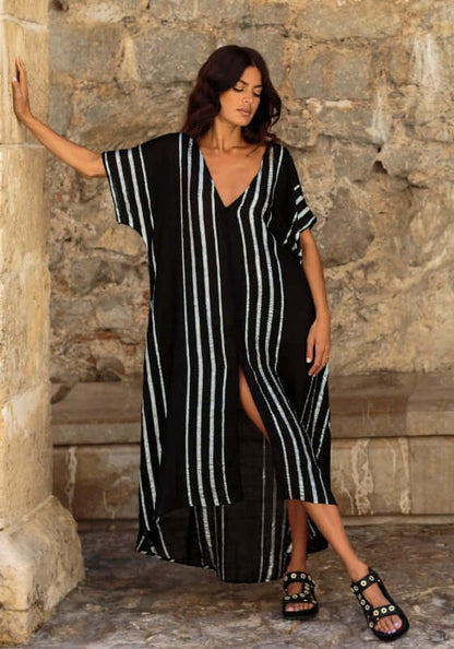 Pitusa’s Metallic Stripes Kaftan in Black is a comfortable midi dress in a light material that allows the dress to free-flow. Featuring a V-neck, V-back and a mid-thigh slit to allow movement.