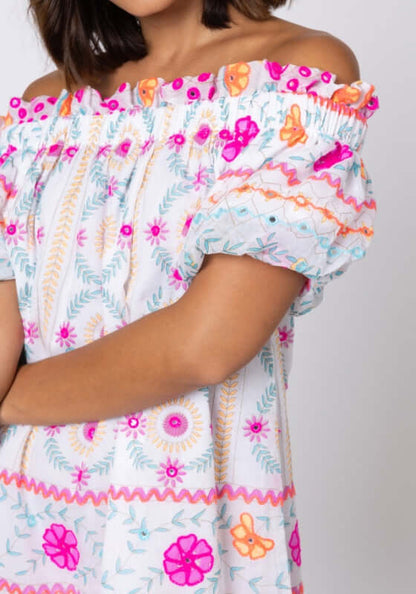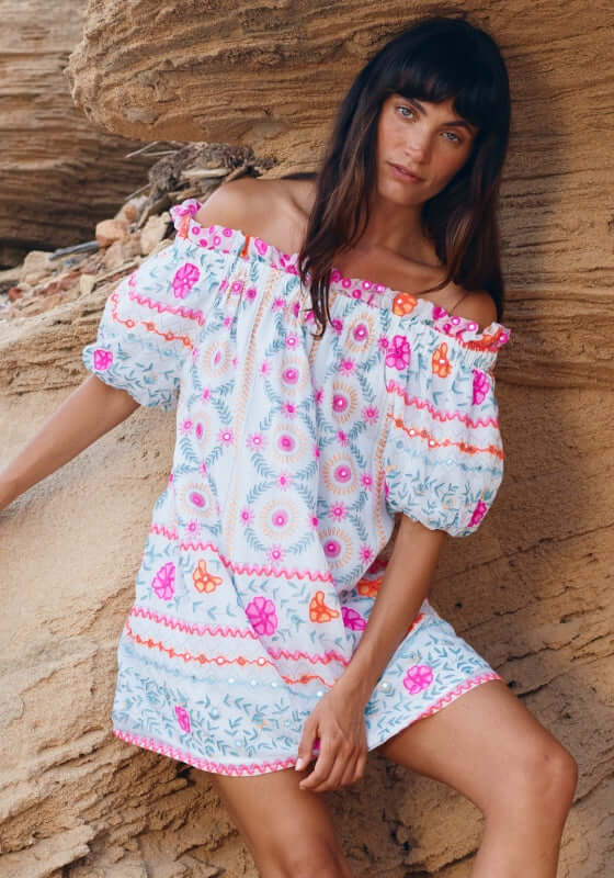 Get ready to turn heads in the Mexican Embroidered Mini Off Shoulder Dress in Whiteby resortwear designer Juliet Dunn! This stunning dress features a unique mexican embroidery that adds a touch of edginess to the classic boho style. Made with high-quality materials, this beach dress is both comfortable and stylish. Featuring an off the shoulder neckline and short puff sleeves.