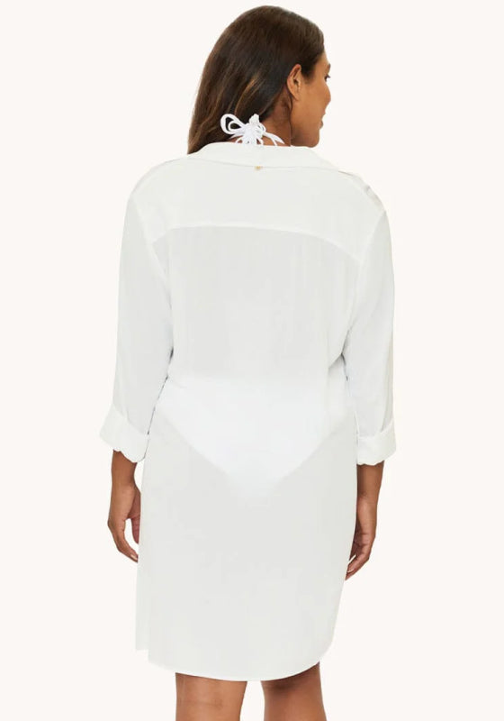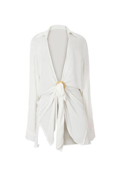 Look effortlessly chic in the Millie Tie Coverup in white by beachwear designer PQ Swim.   Made from lightweight silky rayon, this shirt style beach coverup features a tie front with ring detail and splits at the sides.