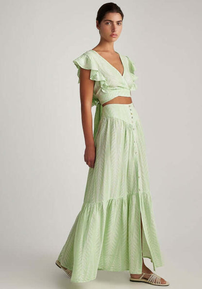Turn heads in the Mint Zakar Skirt by beachwear designer Pearl and Caviar. This piece features a v detail to create a flattering shape with button detailing and a tiered design to elevate the shape. Paired with the Mint Zakar crop top to complete the look.