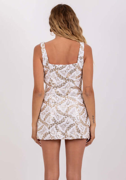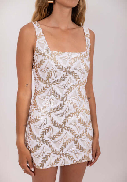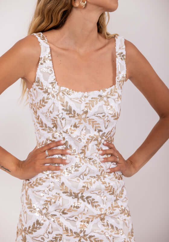Add some sparkle to your wardrobe with the Mira Dress White Gold Feuillage by resortwear designer Sundress. This stunning dress is adorned with sequins in a unique leaf design and features a flattering square neckline. Complete with an invisible back zipper for a seamless fit. Shine bright with Mira Dress.