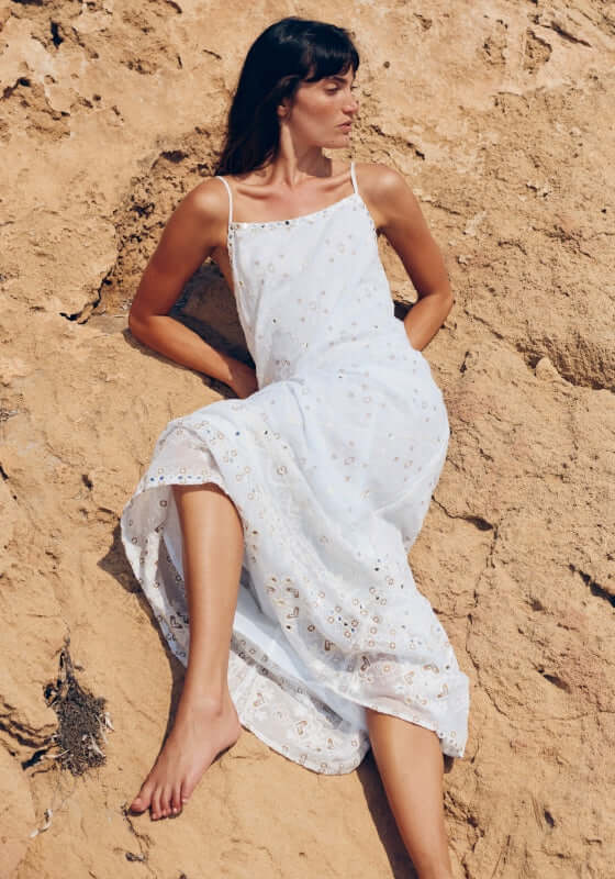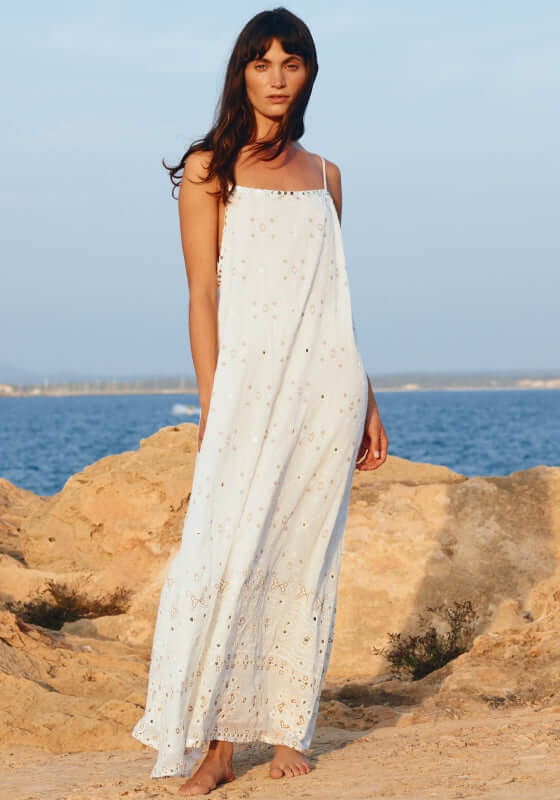 Look effortlessly chic in the embroidery Maxi Dress in mosaic white by beachwear designer Juliet Dunn. In white with mosaic embroidery, this relaxed fit midi beach dress features spaghetti straps and a square neckline. 100% cotton