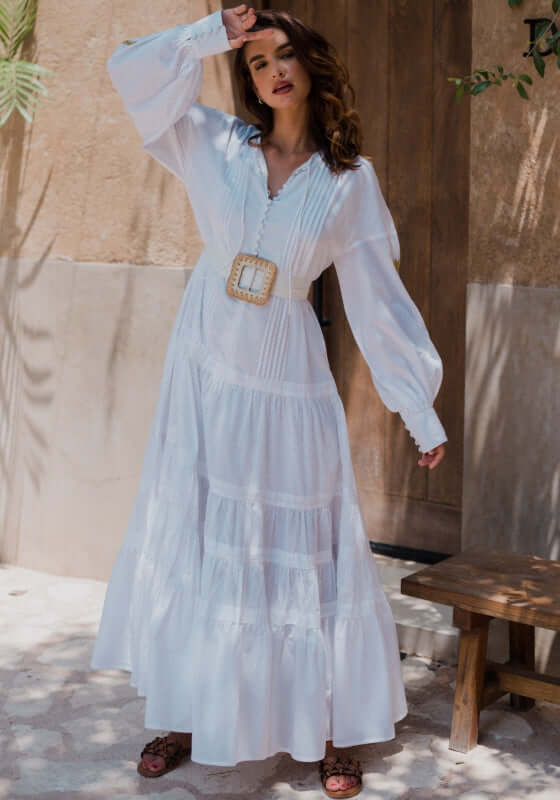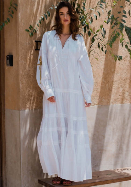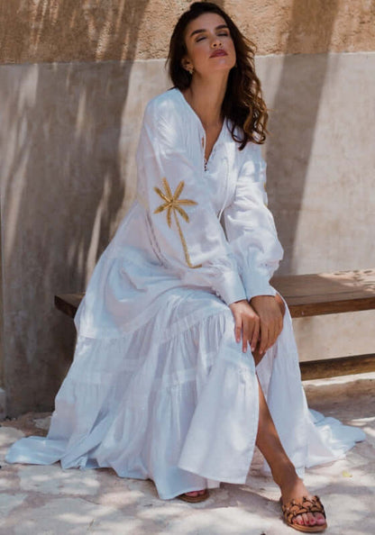 Elevate your style with Nady, the perfect dress by resortwear designer Sundress for any occasion. Its light material and gathered skirt create effortless movement, while the neckline tie closure and embroidered details add a touch of femininity. Complete the look with the elastic waist belt, and let the sun and palm tree design bring a tropical flair.