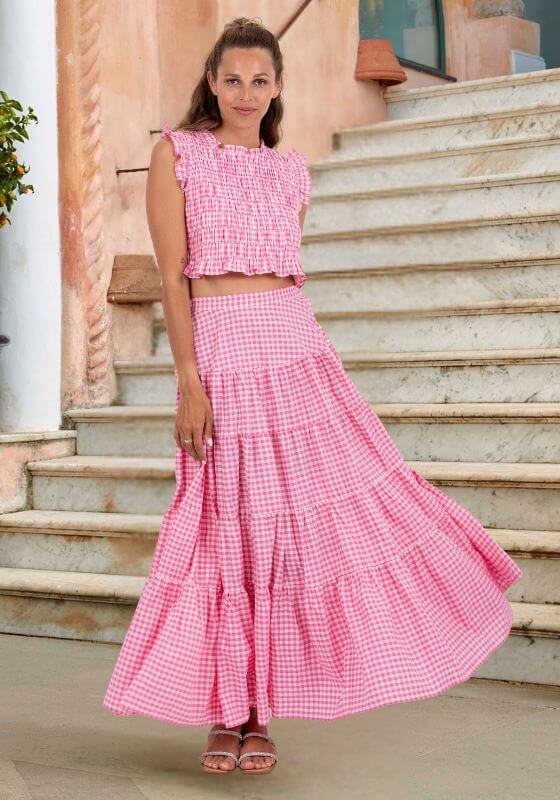 Upgrade your summer wardrobe with the Odette Skirt in Pink Gingham from resortwear designer Sundress. This tiered maxi skirt offers comfort and style, making it the perfect addition to your warm weather outfits. Elevate your look with this charming beach skirt and match it with the malone top to complete your look.