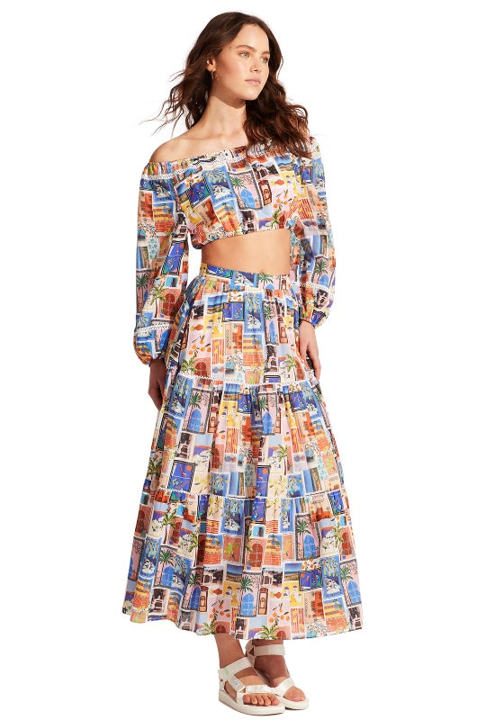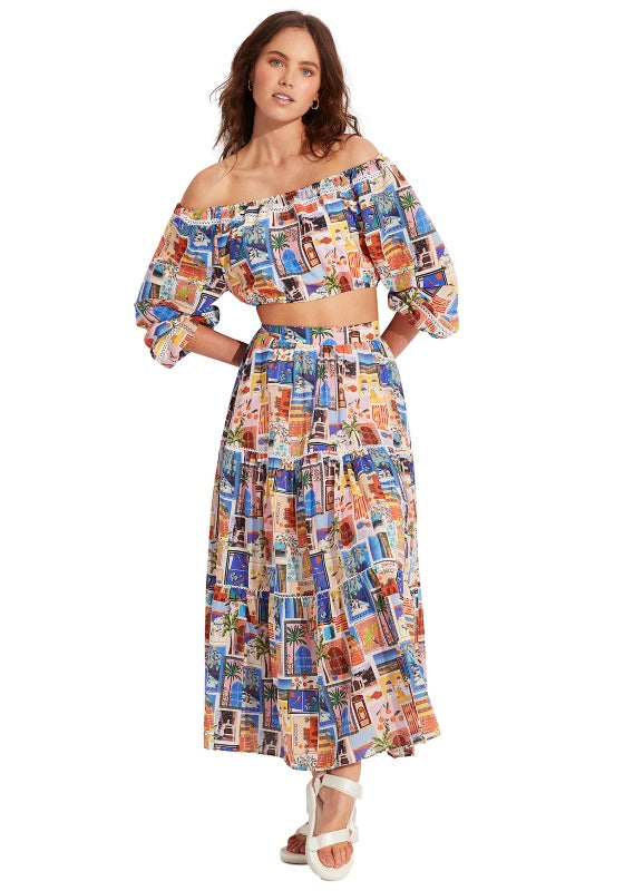 Live la dolce vita in the beautiful On Vacation Crop Top by beachwear designer Seafolly.    In a tropical postcard print, this off the shoulder crop top features an elasticated neckline and waist, with cut out crochet detailing and wide blouson sleeves.   Made from 100% cotton.