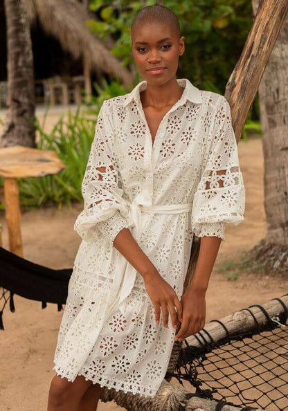 Turn heads in the stunning Oriana Dress in White by resortwear designer Miss June.   In crisp white broderie angalise, this button down dress features bell sleeves with elasticated cuffs, optional slip and a self tie belt.   Available in one size fits UK 8-14.