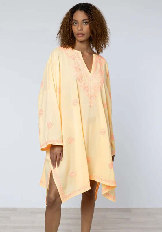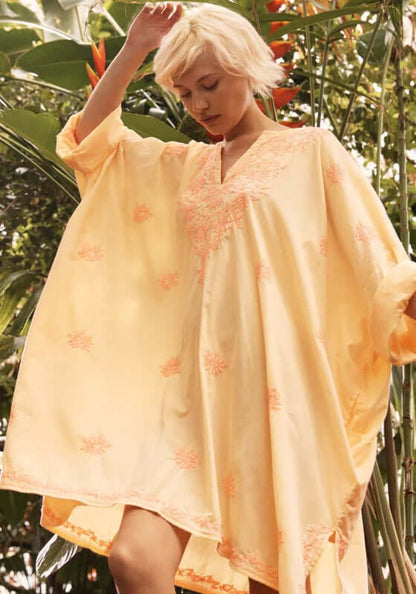 Add a pop of colour to your vacation wardrobe with the Embroidered Beach Kaftan in Melon by beachwear designer Juliet Dunn. This v neck kaftan features wide sleeves with a loose fit.