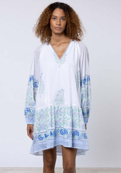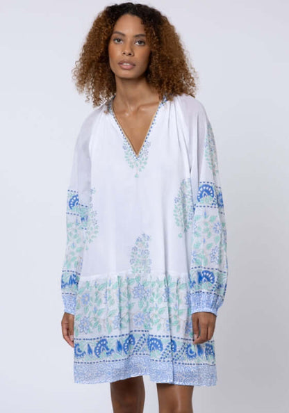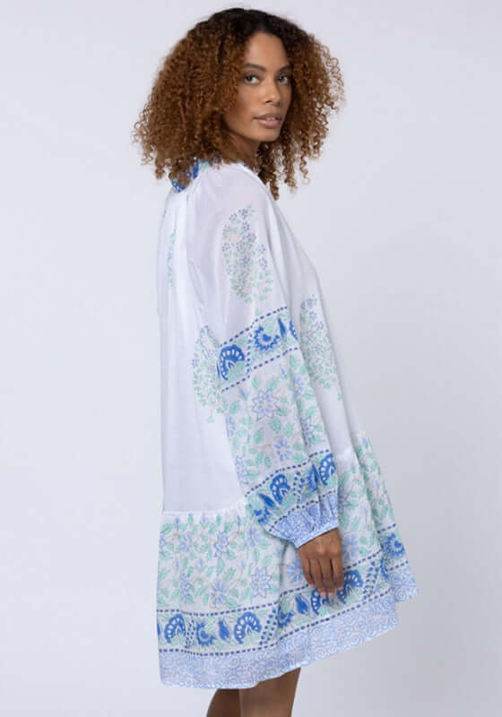 Get ready to turn heads in the embroidered Frill Dress in Periwinkle and White Paisley print by resortwear designer Juliet Dunn. The mini dress features a unique mosaic print in white that is both eye-catching and on-trend. Perfect for your next resort vacation or summer outing, this beach dress will have you feeling stylish and confident.