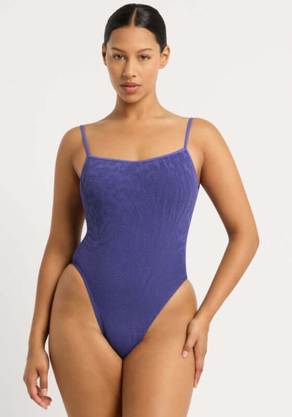 Look effortlessly chic in the Palace Swimsuit in Animalia by swimwear designer Bond Eye. This crinkle one piece has a flattering scoop neckline, spaghetti straps and a low scoop back. It offers medium coverage on the bottom, and the sides can be pulled up or down to create a high or low legline to suit. Made from sculpting stretchy crinkle fabric, available in one size fits 8-14 UK.