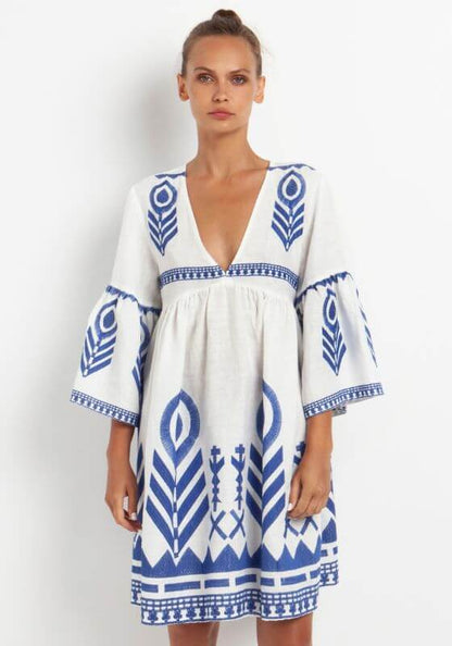 Look effortlessly chic this summer in the Peacock Mini Embroidered Dress by resortwear designer Greek Archaic Kori. This loose fit summer dress features a low V neckline with flared mid length sleeves finished with a peacock inspired blue embroidery detail. Perfect to take you from exploring the city straight to the beach. This dress is slightly oversized so we recommend sizing down