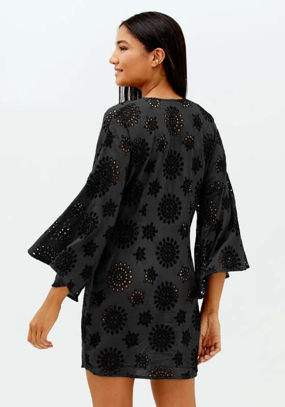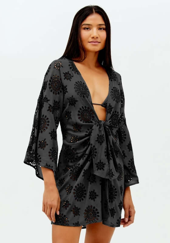 Elevate your poolside look with the Perola Beach Kaftan in Black by swimwear designer Vix. This must have beach cover up features a tie waist and wide fluted sleeves to create an elegant silhouette.