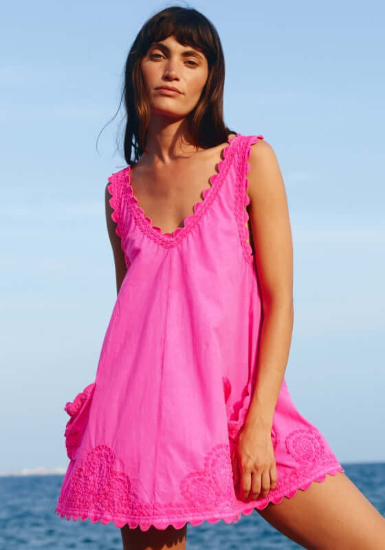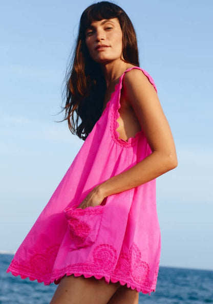 Complete your poolside look with the Poplin Low Back Dress in Indian Pink, by beachwear designer Juliet Dunn. In Juliet Dunn’s poplin floral print cotton with scalloped trim, this one size mini beach dress is lightweight and roomy, perfect for beach walks and poolside lunches. Available in one size fits 8-12 UK.