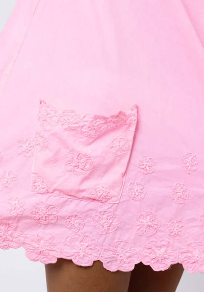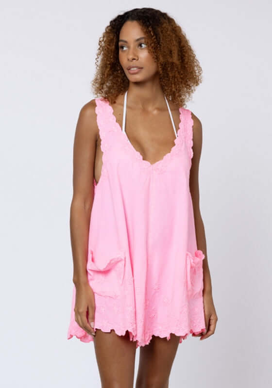 Complete your poolside look with the Poplin Low Back Dress in Pastel Pink, by beachwear designer Juliet Dunn. In Juliet Dunn’s poplin floral print cotton with scalloped trim, this one size mini beach dress is lightweight and roomy, perfect for beach walks and poolside lunches. Available in one size fits 8-12 UK.