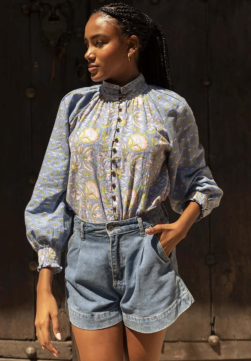 Look chic in the stylish Raquel Blouse in Blue by Resortwear designer Miss June.  In a soft blue print, this elegant beach shirt features a button down front with a flattering high neckline and wide balloon sleeves.   Available in one size fits most from size UK 8 – 14.