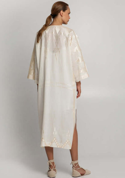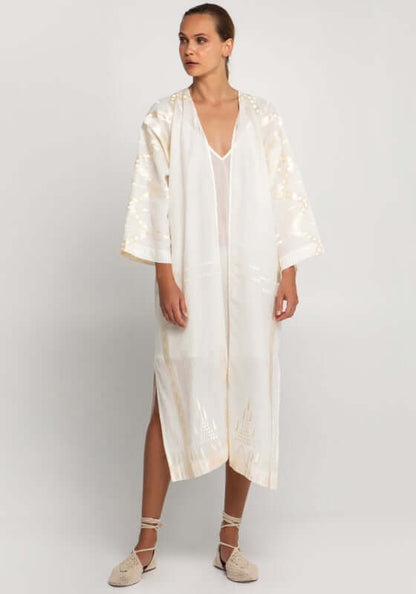 Introducing the Roots Kimono in Natural with delicate Champagne embroidery by resortwear designer Greek Archaic Kori. This elegant kimono adds a touch of sophistication to any outfit. Made with premium quality fabric, it's lightweight and comfortable to wear. Elevate your wardrobe with this versatile and stylish piece.
