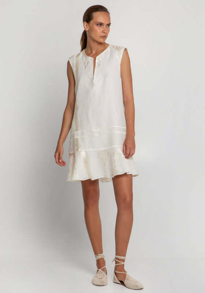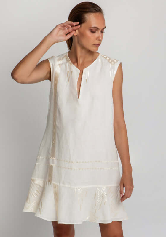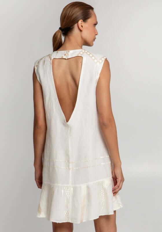 Upgrade your summer wardrobe with the Roots Sleeveless Mini Dress in Natural by resortwear Greek Archaic Kori. This elegant dress features delicate champagne embroidery and a keyhole back, adding a touch of sophistication to your look. Stay cool and stylish in this must-have piece.