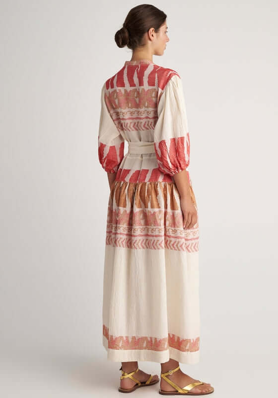 Look effortlessly chic in the Scorpios Belted Maxi Dress in red by resortwear designer Pearl & Caviar.   Made from soft cotton with contrasting panels, this stylish maxi dress features a v neckline and button down front, along with self tie belt.  100% Cotton