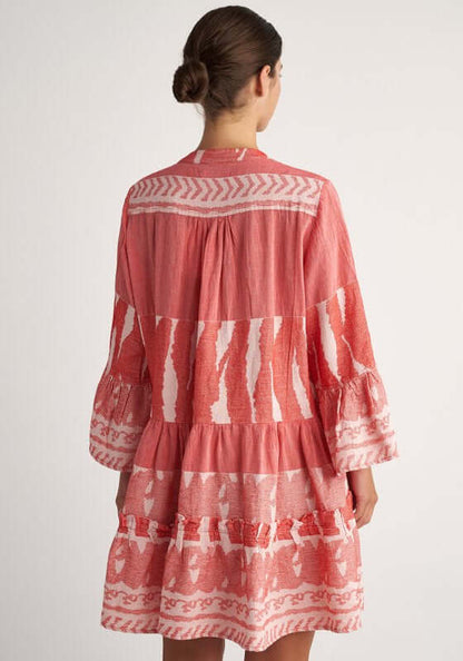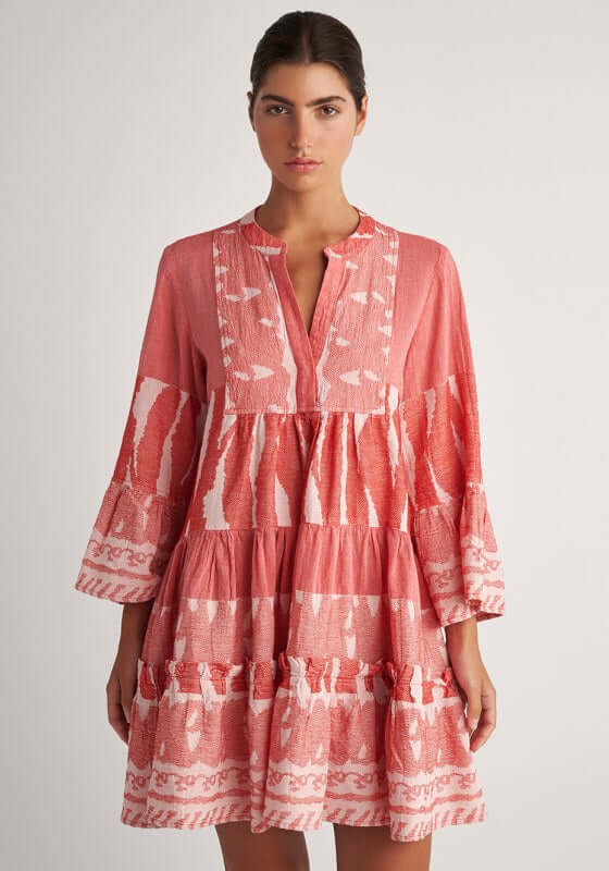 Turn heads in the stunning Scorpios Dress in Red by resortwear designer Pearl & Caviar.   This versatile cotton dress can be worn as both a dress or a beach kaftan, features a v neckline, bell sleeves and a contrasting tiered skirt.