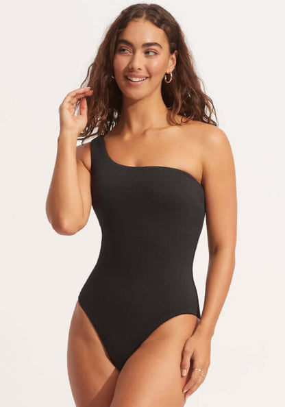 Look effortlessly chic the SeaDive One Shoulder Swimsuit in Black by beachwear designer Seafolly.  In a classic black, the pull on one shoulder swimsuit is made of soft ruched fabric with cups for shape and support.