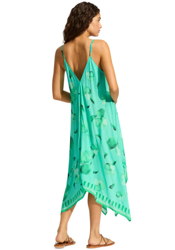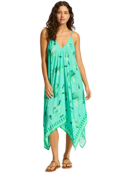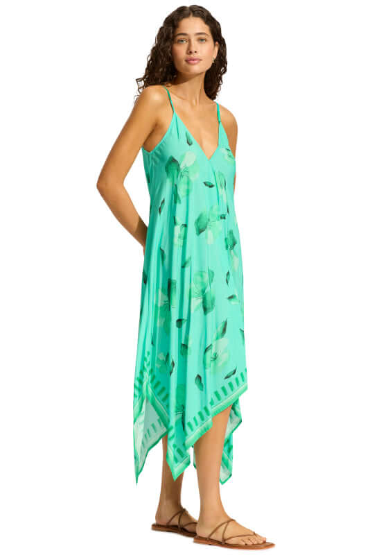 The Secret Garden Scarf Dress in Jade by beachwear designer Seafolly is the perfect throw on after sitting by the pool for lunch. With a hankerchief hem and v neckline.
