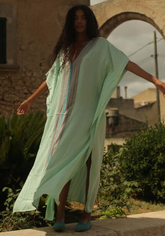 Look effortlessly chic in the Checkered Sequin Thobe in Aqua by resortwear designer Pitusa. Featuring a deep V neckline with Inca trim detailing and relaxed flutter sleeves. The relaxed maxi style features a chic striped print with a contrast stripe down the centre and side splits, the perfect poolside cover up. Available in one size fits 8-14, in two different lengths Petite (132cm) or Standard (139cm). 100% Viscose