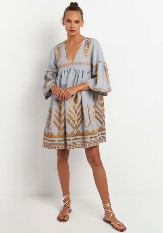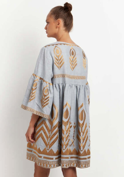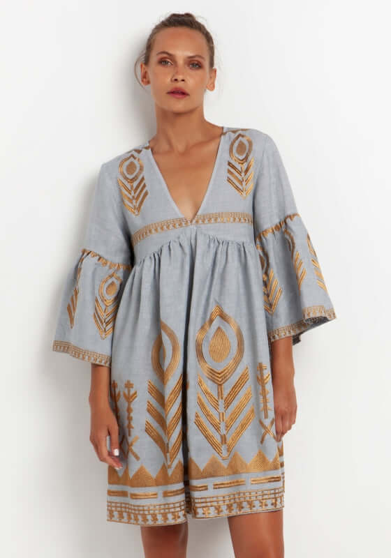 Make a statement in the Short Flared Sleeve Dress in Grey by resortwear designer Greek Archaic Kori. This throw on a go dress is the perfect item too keep you feeling cool and looking stylish on a summers day. Featuring a low v neckline and mid length flared sleeved finished with a stunning peacock inspired copper embroidery.