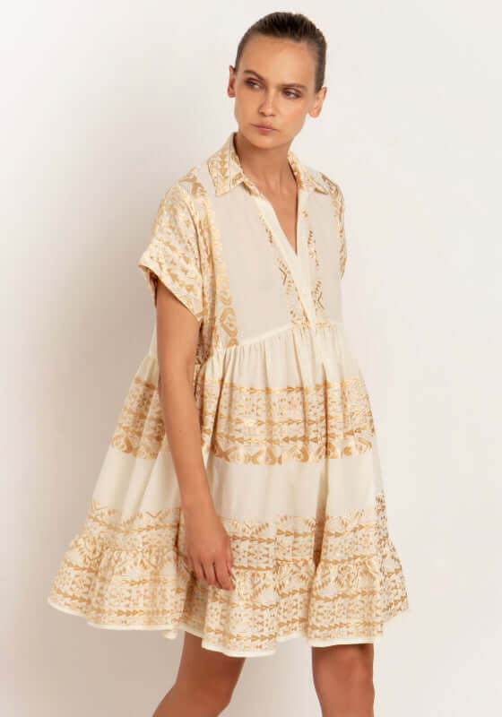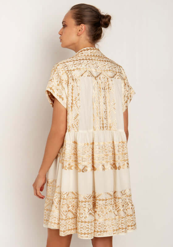 Turn heads in the stunning Short Sleeveless Dress with Triangle Embroidery by resortwear designer Greek Archaic Kori. This beautiful mini dress in natural cotton with gold embroidery, features a v neckline with a collar and a loose tiered skirt. Greek Archaic Kori run larger so we recommend sizing down.