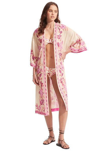 Look effortlessly chic in the Silk Road Kimono in Parfait Pink by Beachwear designer Seafolly. This stunning beach Kimono feature an open front with a tie waist belt and side slits. In a hand drawn vintage floral print by Seafolly HQ this is truly a unique addition to your holiday wardrobe.