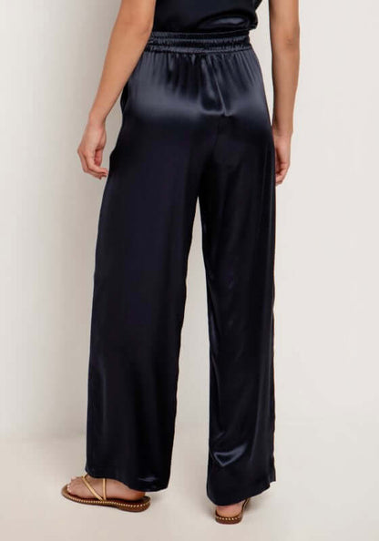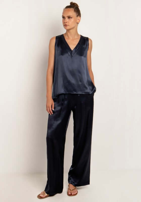 Look chic and sleek in the Silk Trousers in Navy by resortwear designer Green Archaic Kori.  These lightweight trousers features a drawstring waistband and side pockets for a relaxed evening look.   Pair with the co-ordinating Silky Tank.