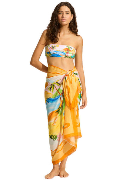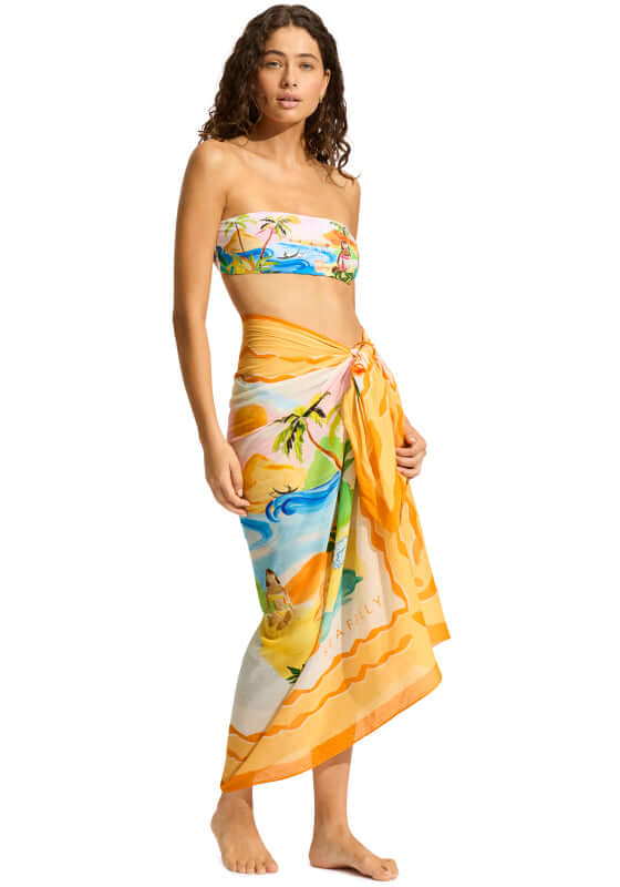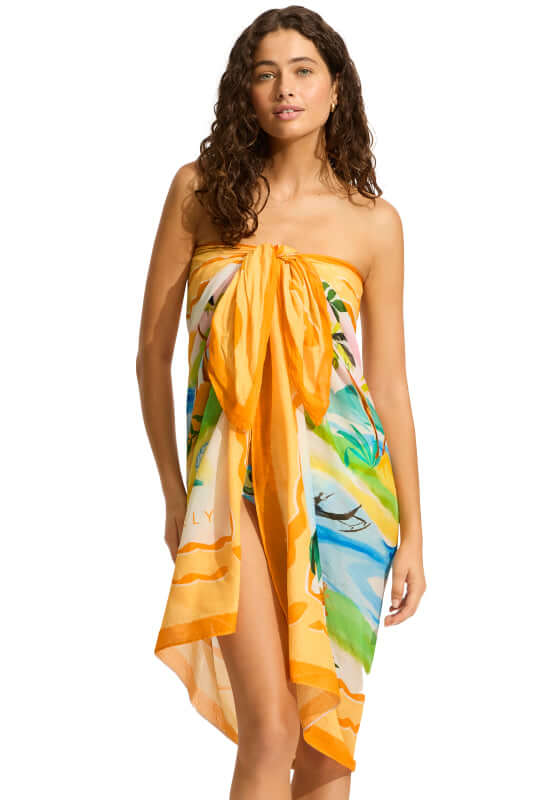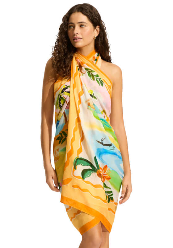 The South Pacific Sarong by designer Seafolly can be styled in several different ways. This bold print can brighten up any bikini or be paired with the matching swimsuit or bikini for a chic poolside look.