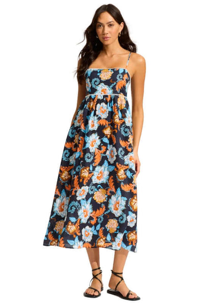 The Midi Dress in True Navy by Seafolly is part of the Spring Festival collection inspired by bohemian and decorative influences. This beach dress features a classic silhouette with a long flowy skirt and cropped top with white lace piping and thin shoulder straps.  100% Linen