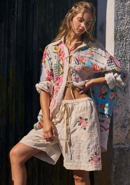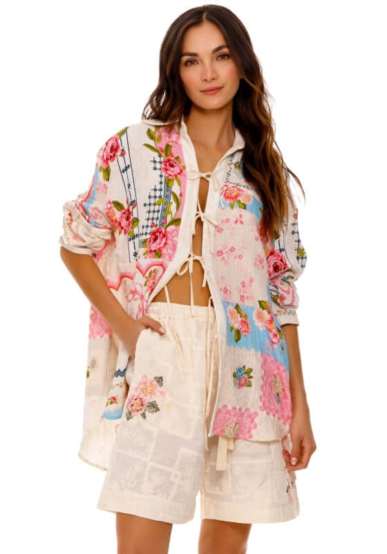 Introducing the Swan Meraki Shirt by beachwear designer Agua Bendita. A versatile and comfortable piece that blends intricate artistry with effortless style. The oversized silhouette and tie-bow front closures add a handcrafted charm, while the delicate floral print offers a touch of subtle elegance. Perfect for layering or wearing on its own.